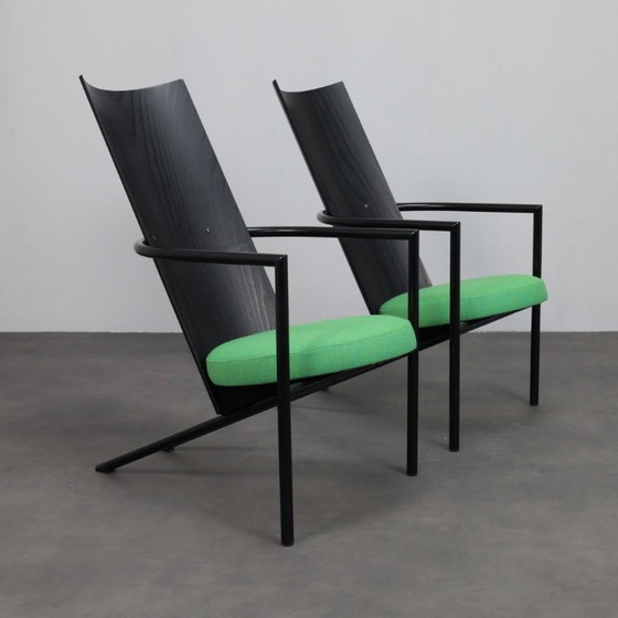 Ein markantes Paar postmoderner Sessel aus den 1980er-Jahren, geprägt von ihrer skulpturalen Silhouette und klaren, architektonischen Linien. Die hohe, geschwungene Rückenlehne aus schwarz gebeiztem Holz verleiht den Sesseln eine kraftvolle vertikale Präsenz, während das grafische Metallgestell ihnen eine strukturelle, fast architektonische Präzision verleiht.