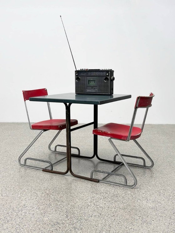 Dieses seltene Ensemble besteht aus zwei ikonischen Aluminium-Stühlen von Cindy Crawford-Steiger für Embru sowie einem passenden Tisch mit industriellem Charme. Die Stühle wurden in der Schweiz in den 1930er Jahren produziert und spiegeln eindrucksvoll den Geist des modernen Funktionalismus wider. Das herausragende Merkmal ist das schwungvolle, freischwingende „Z“-Gestell aus gebogenem Rundstahlrohr, das durch seine klare Formensprache und Stabilität überzeugt. Sitz- und Rückenflächen sind aus rot lackiertem Aluminium gefertigt und mit Nieten am Gestell befestigt – ein Design, das Form und Funktion perfekt vereint.