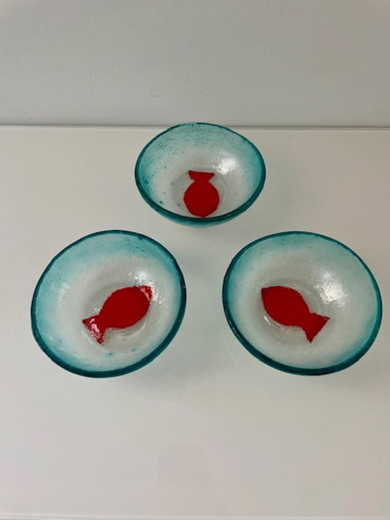 Set aus 3 handgefertigten Glasschalen mit Fischmotiv