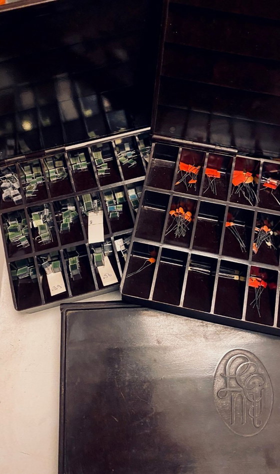 Einzigartiges Set aus drei originalen Malmberg-Setzkästen. Zwei davon sind gefüllt mit Dutzenden von Vintage-Elektronikbauteilen aus der analogen Ära. Darunter befinden sich Folienkondensatoren, Transistoren und andere besondere Bauteile – sorgfältig sortiert und beschriftet. Der dritte Kasten ist leer und bereit für Ihre eigenen Zwecke.