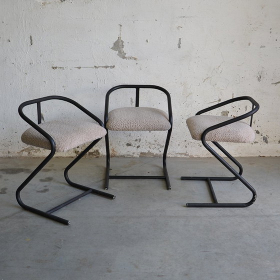 Dieses Set aus drei Rohrstühlen im Stil der 1980er-Jahre vereint ein elegantes Metallgestell mit bequemen Stoffsitzen in Schwarz und Beige. Die Stühle passen perfekt zu Retro- oder modernen Einrichtungen und bieten Stil und Komfort zugleich. Ihr einzigartiges Design macht sie zu einem echten Hingucker in jedem Raum.