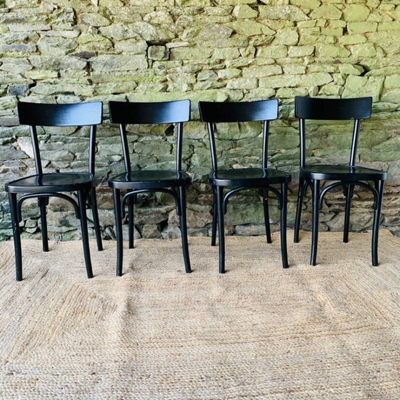 Authentisches Set aus vier alten Bistrostühlen, die schwarz gestrichen wurden. Die Stühle sind komplett aus Holz und haben ihre klassische Linie mit einer gebogenen Rückenlehne und einer flachen Sitzfläche beibehalten, die typisch für Bistro-Möbel sind. Die neu lackierte Oberfläche verleiht ihnen ein neues Leben und bewahrt ihren ursprünglichen Charme. Sie sind robust und bequem und passen sowohl an einen Esstisch als auch in eine Küche oder einen geselligen Raum im Vintage-Stil - Einige Zeit- und Gebrauchsspuren wie Flecken, Kratzer, Verfärbungen, Reibungen, Stöße und andere Spuren - {Höhe: 80, 5cm - Sitzhöhe: 47cm - Breite: 42cm - Sitzbreite: 40cm - Tiefe: 44cm - Sitztiefe: 41cm} - Lieferung möglich|Kontaktieren Sie uns.