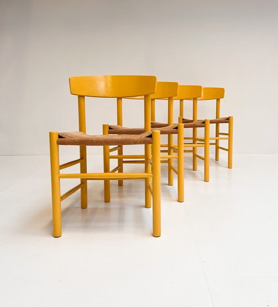 Zeitloses dänisches Vintage-Design! Dieser Stuhl, Modell J39, auch bekannt als „Volksstuhl“, war früher in vielen dänischen Haushalten zu finden. Ein traditioneller Entwurf von Børge Mogensen für FDB Møbler aus dem Jahr 1947. Dieses Set stammt vermutlich aus den 1970er-Jahren. Der Stuhl hat ein Eichengestell und eine Sitzfläche aus Papierkordel. Die originale pastellgelbe Farbe wirkt stimmungsvoll und ist wieder voll im Trend. Die Stühle sind stabil und weisen leichte Gebrauchsspuren am Lack auf. Die Sitzflächen zeigen altersbedingte, leichte Flecken. Wunderschön in ihrer Schlichtheit!
