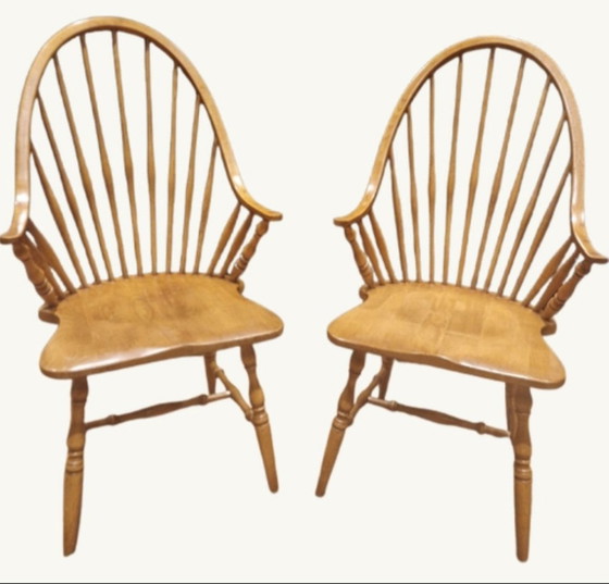 Sechs klassische Windsor-Spindelstühle. Dieses Modell besticht durch bequeme Armlehnen und hohen Sitzkomfort. Ein echter Klassiker. In einem schönen hellen Holzton, aus Slowenien. Alle Stühle sind für ihr Alter in gutem Zustand. Verkauf nur als Set.