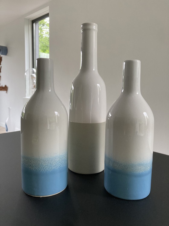Neuwertiger Zustand, keine Beschädigungen. Die blauen Flaschen sind 21 cm hoch und haben einen Durchmesser von 7 cm, die grauen Flaschen sind 27 cm hoch und haben einen Durchmesser von 8 cm.