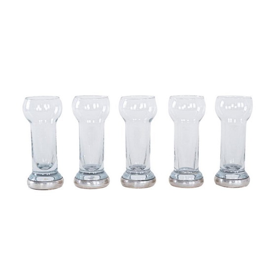 Ein Set aus fünf Vintage-Kristallgläsern aus den 1970er-Jahren mit einem dezenten Silberrand. Die Gläser eignen sich perfekt zum Servieren von Wasser, Säften, Getränken oder Cocktails und sind gleichzeitig ein attraktiver Blickfang auf dem Tisch oder in der Vitrine. Ideal für Liebhaber von Vintage-Glaswaren und Sammler von Design der 1970er-Jahre.