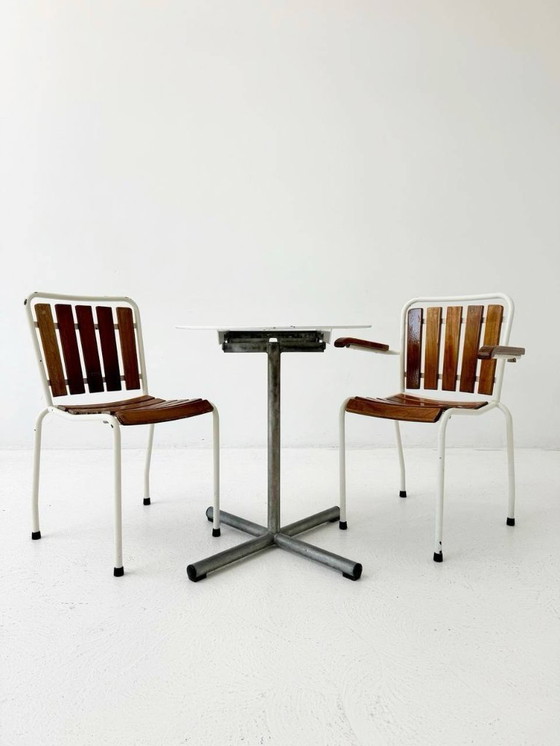 Dieses charmante Set besteht aus zwei Gartenstühlen und einem klappbaren Tisch von BIGLA, hergestellt in den 1940er Jahren in der Schweiz.