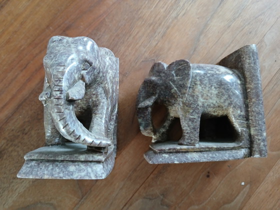 Dieses Vintage-Set aus Elefanten-Buchstützen ist eine wunderschöne Bereicherung für jedes Zimmer. Der handgeschnitzte Naturstein verleiht ihnen einen einzigartigen und traditionellen Look. Die Buchstützen stammen aus den 1960er-Jahren und haben jeweils die Maße 6 x 12 x 10 cm.