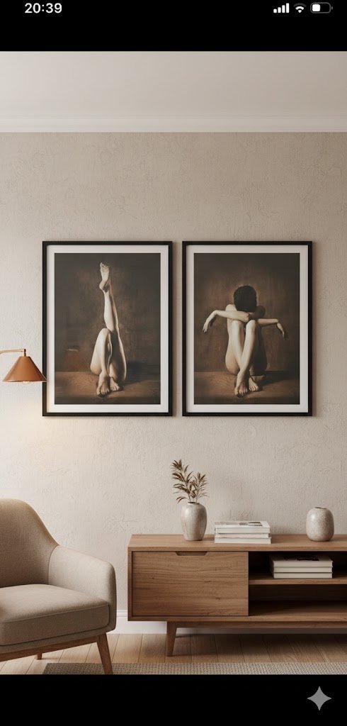 Verschönern Sie Ihr Zuhause mit diesem exquisiten Set aus zwei Kunstdrucken, die die stille Schönheit des menschlichen Körpers einfangen. Die in einer raffinierten Farbpalette gehaltenen Kunstwerke laden zum Verweilen ein und verleihen jedem Raum einen Hauch von Eleganz. Ideal für alle, die das subtile Spiel von Licht und Schatten zu schätzen wissen – diese Drucke zeugen von erlesenem Geschmack und künstlerischem Ausdruck.