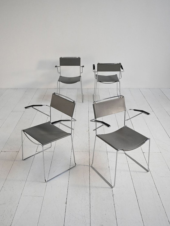 Vier „Spaghetti“-Stühle, entworfen von Giandomenico Belotti für Alias Ende der 1970er Jahre, sind eine Ikone des italienischen Industriedesigns. Das verchromte Stahlgestell bildet eine durchgehende, leichte Linie, kombiniert mit einer gestreckten, technisch anmutenden Sitzfläche und Rückenlehne. Ein Design, das auf Reduktion basiert und bei dem Form und Ergonomie perfekt harmonieren. Hergestellt von Alias, einem der wichtigsten Innovatoren im italienischen Design.