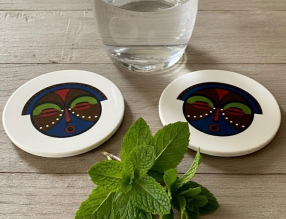 Set mit 6 ethnischen Keramikuntersetzern mit Stammesmasken