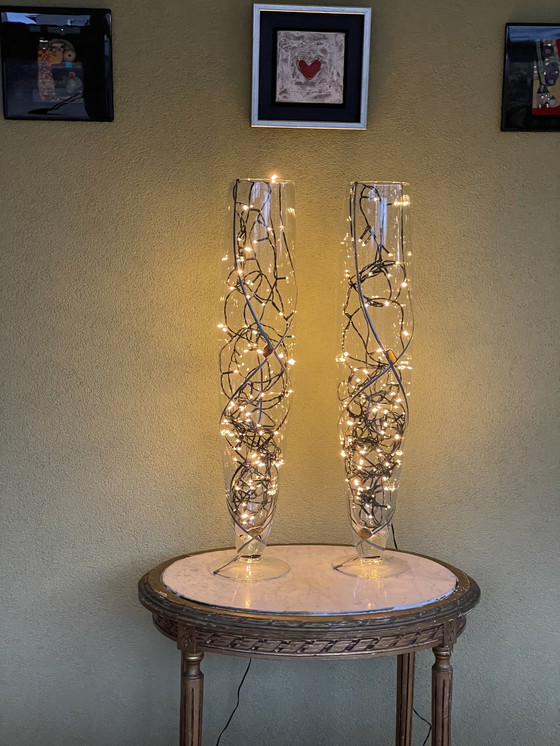 Unieke mondgeblazen en handbewerkte glazen vazen 70cm hoog.