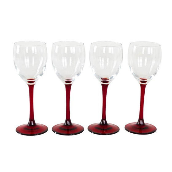 Weingläser, 4er-Set, Vintage. Die eleganten, klassischen Kelche stehen auf hohen Stielen und sind in einem tiefen Rotton gehalten, was ihnen eine besondere Note verleiht. Sie eignen sich perfekt für besondere Anlässe und sind ein stilvolles Dekorationselement auf dem Tisch. Ideal für Liebhaber einzigartiger, zeitloser Details.