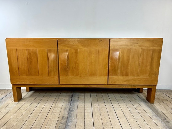 Massives Ulmen-Sideboard von Maison Regain, 1970. Die Front besteht aus drei Türen mit horizontalen und vertikalen Holzverbindungen. Die Türgriffe sind aus dem Holz geschnitzt, Ober- und Seitenflächen sind gezinkt. Im Inneren befinden sich links und mittig breite Einlegeböden sowie rechts ein Staufach mit zwei Schubladen. Die Türen schließen magnetisch.