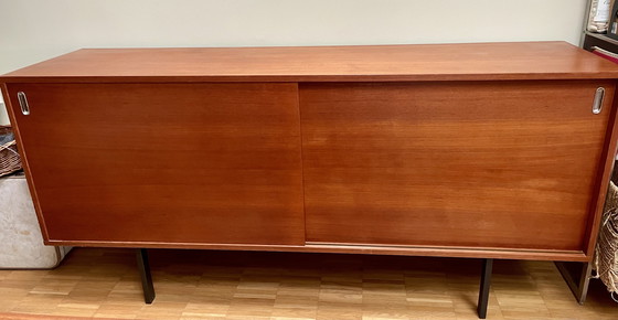 Entdecken Sie die zeitlose Eleganz dieses Sideboards von Pierre Guariche, ein Meisterwerk des Mid-Century-Modern-Designs. Seine klaren Linien und die warme Holzoberfläche verleihen ihm eine unvergleichliche Raffinesse und machen es zur idealen Ergänzung für jedes stilvolle Interieur.