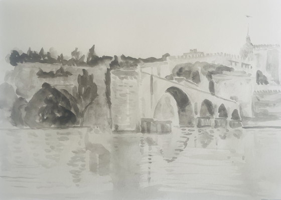 Signiertes Aquarell monochrom sepia Pont d'Avignon