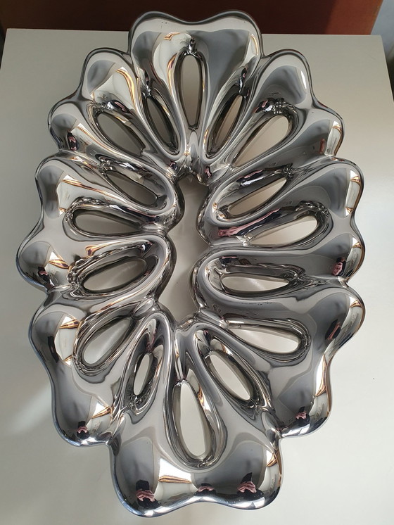 Schöne Design-Schale aus Keramik. Farbe: Silber, durchbrochen. Abmessungen: B40cm, T25cm, H8cm. In sehr sauberem Zustand, wenige kleine Kratzer (siehe Fotos).