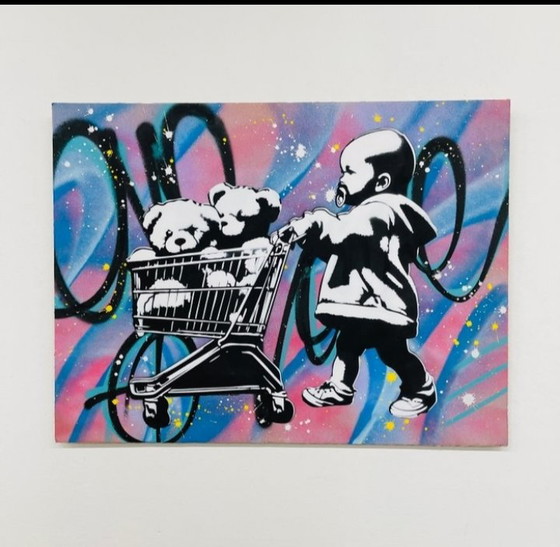 Tauchen Sie ein in die Welt der zeitgenössischen Kunst mit „Born to Shop“ von SINAO, einem Werk, das die Essenz urbaner Kultur durch eine kraftvolle und farbenfrohe Bildsprache einfängt. Dieses einzigartige Leinwandbild zeigt ein Kind, das einen Einkaufswagen schiebt – ein Bild, das zum Nachdenken über die moderne Konsumgesellschaft anregt.