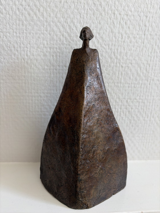 Kleine, aber ausdrucksstarke Bronzeskulptur der niederländischen Bildhauerin Sjikkie (Tjikkie) Kreuger, bekannt für ihre stilisierten, monumentalen Figuren. Das Werk zeigt eine stehende Frauenfigur in stark vereinfachter, fast monolithischer Form, charakteristisch für Kreugers Schaffen.