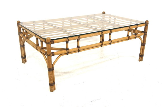 Rattan-Couchtisch, entworfen in Schweden in den 1970er Jahren. Glasplatte, Rattangestell. In exzellentem Zustand, sehr stabil mit minimalen Gebrauchsspuren. 28535