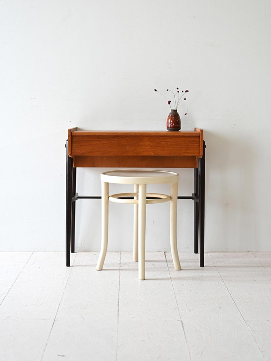 Die Holzbeine sind schwarz lackiert. Ideal als Eingangsmöbel, aber auch als kleiner Arbeitsbereich für den Computer. Guter Zustand. Er kann Gebrauchsspuren aufweisen. Bitte beachten Sie die Fotos. AE857