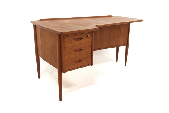 Teakholz-Schreibtisch, entworfen vom schwedischen Hersteller Lelångs Möbelfabrik in den 1950er Jahren. Ein hochfunktionaler Schreibtisch mit ikonischer Linienführung. In exzellentem Zustand mit minimalen Gebrauchsspuren (siehe Fotos). Authentischer Vintage-Zustand. 28523