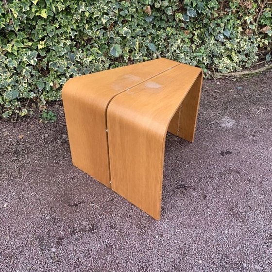 Ein wunderschöner Couchtisch aus den 1970er-Jahren, der sich auch als Beistelltisch oder Ecktisch eignet und skandinavisch inspiriert ist. Seine Trapezform verleiht ihm eine originelle und elegante Silhouette, typisch für nordisches Design jener Zeit. Er ist aus laminiertem Buchenholz gefertigt und vereint die Wärme des Holzes mit guter Haltbarkeit. Dank seiner klaren Linien und des sanften Fußes lässt er sich mühelos in Vintage-, moderne oder Designer-Einrichtungen integrieren. Er weist alters- und gebrauchsbedingte Spuren wie Flecken, Kratzer, Verfärbungen, Abnutzungen und andere Gebrauchsspuren auf (Höhe: 51 cm – Breite: 62 cm – Tiefe: 24 und 62 cm).