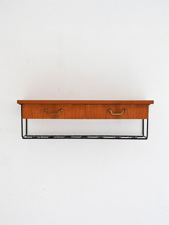 Eleganter skandinavischer Wandnachttisch aus den 1960er-Jahren mit schwarzem Metallgestell und zwei Teakholzschubladen in warmem, natürlichem Farbton. Die Messinggriffe verleihen ihm einen raffinierten Retro-Touch, während das klare und funktionale Design die Essenz des nordischen Stils der Mitte des 20. Jahrhunderts verkörpert. Der untere Teil dient als Zeitschriftenablage oder zusätzliche Ablagefläche und macht den Nachttisch zu einem praktischen und optisch leichten Möbelstück – ideal als Nachttisch oder kleines Regal im Eingangsbereich. Guter Zustand. Altersbedingte Gebrauchsspuren möglich. Bitte beachten Sie die Fotos.