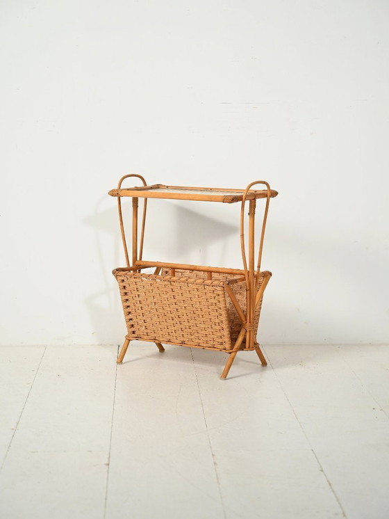 Gebogene Bambusstreben mit sichtbaren Verzierungen prägen das Gestell, während der untere Bambuskorb für Struktur und Tiefe sorgt. Die obere Ablage verfügt über eine in den Bambusrahmen eingelassene Glasplatte. Ausgestellte Füße und kompakte Proportionen unterstreichen den handgefertigten Charakter der 1960er Jahre.