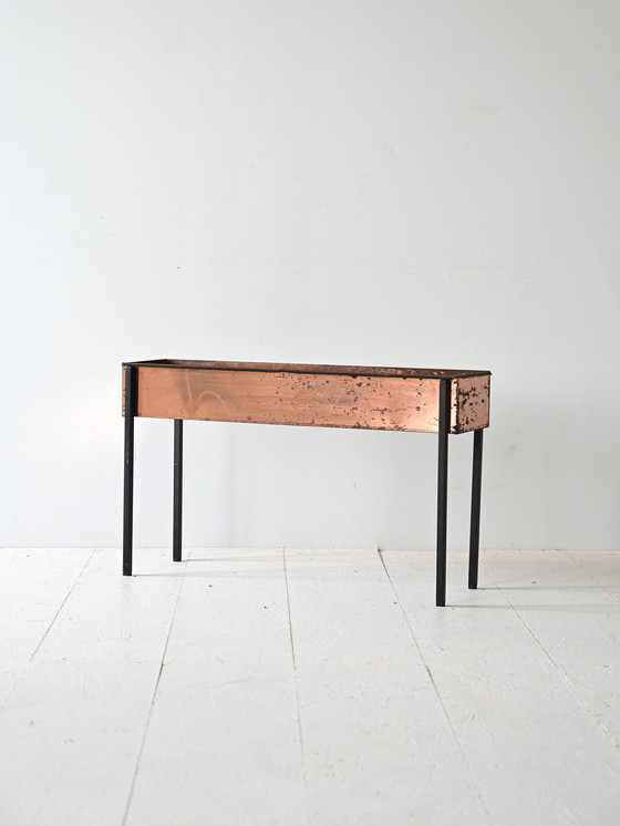 Der rechteckige Kupferrahmen wird von schlanken, geradlinigen Beinen aus schwarzem Metall getragen, die ihm Leichtigkeit und Stabilität verleihen. Perfekt für alle, die ein dekoratives Objekt suchen, das Funktionalität und Retro-Stil vereint. Guter Zustand. Kann einige Anzeichen von Alterung aufweisen. Bitte beachten Sie die Fotos.