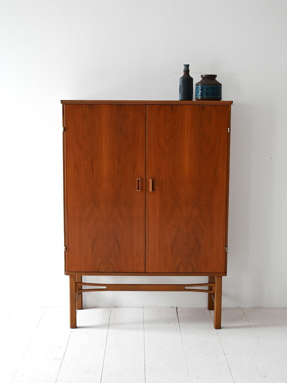 Die geradlinigen Beine erleichtern sein Aussehen. Im Inneren ist der Raum durch zwei Regale unterteilt, während sich am Boden kleine ausziehbare Regale befinden.Guter Zustand. Er kann Gebrauchsspuren aufweisen. Bitte beachten Sie die Fotos. AE492