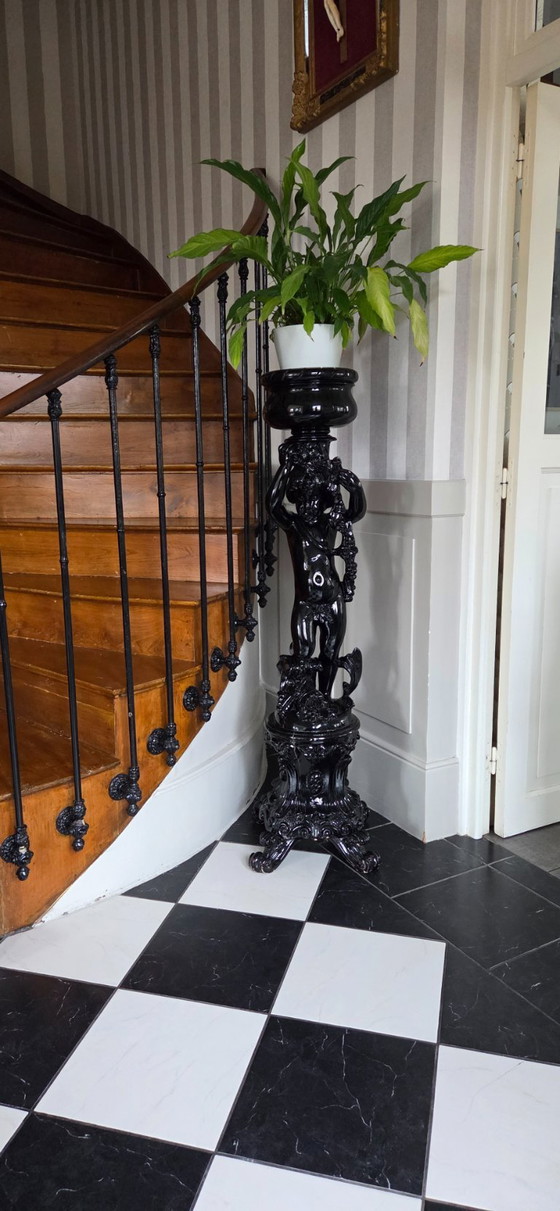 Ein Pflanzkübel auf einem Ständer, verziert mit einem Putto auf einem vierbeinigen Sockel, der ein aus einem einzigen Stück Holz geschnitztes Becken trägt.