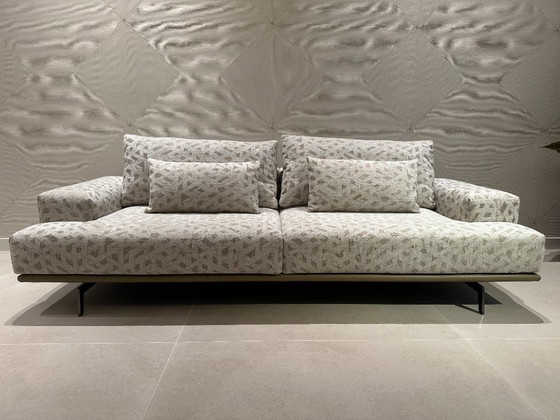 Exklusive Upper Ba Papadatos Sofas, fabrikneu und unbenutzt. Bezogen mit einem leichten, eleganten Stoff mit dezentem geometrischem Muster, der dem Sofa eine edle und zeitlose Optik verleiht. Die klaren Linien, das niedrige Profil und die schlanken Beine schaffen eine moderne, luftige Atmosphäre, während die großzügigen Kissen hervorragenden Komfort bieten. Ein echtes Designstück, das jedem modernen Interieur unaufdringlichen Luxus verleiht.