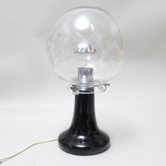 Materialien: Schwarzes Glas, Kugel aus dickem, transparentem Glas, verchromtes Metall.