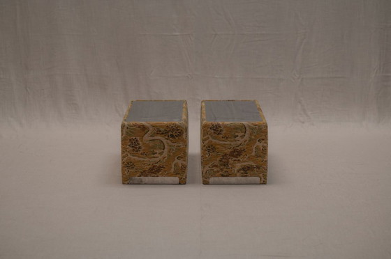 Markantes Set aus zwei Couchtischen von Saporiti aus den 1970er Jahren, ein markanter Ausdruck italienischen Space-Age-Designs. Die skulpturale, würfelartige Form ist frisch mit luxuriösem Pariser Jacquardstoff bezogen, der der geometrischen Silhouette Tiefe, Struktur und eine raffinierte Note verleiht.