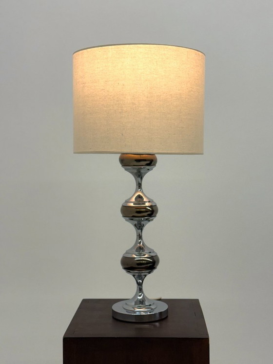 Vintage-Tischleuchte im Space-Age-Stil mit einem eleganten, skulpturalen Sockel aus Chrom und dunklen Silberakzenten. Der Sockel besteht aus drei Kugeln, die zusammen einen verspielten und futuristischen Effekt erzeugen, typisch für den Space Age-Stil der 1960er und 1970er Jahre.