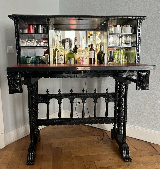 Alter Spanischer Sekretär, Bargueno, ca. 1900, im Renaissance-Stil. Vollständig aufgearbeitet im Sommer 2021 von Kunsttischlerei in Berlin. Umbau zum Barschrank: Verspiegelt, Lichtbänder LED, rechts und links Fächer für Glas, in der Mitte Flaschen. Schrankboden bezogen mit schwarz-silbernem Leder, Klappe mit feinem roten Leder belegt. Schlüssel vorhanden, Schlüsselloch aufwendig verziert und mit rotem Leder hinterlegt. Der Sekretär ist wunderschön aufgearbeitet und jetzt wirklich ein Gedicht. Keine Ränder oder Flecken, zwar in Gebrauch, aber sehr selten. Sehr charmantes Möbelstück, edel, überraschend und ein echter Eye-catcher!