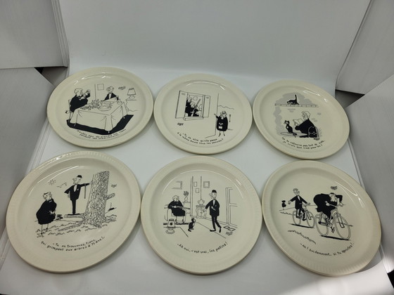 Sprechende Teller Saint Amand Illustration von Jacques Faizant Fayence Frankreich 1970 (6er Set)