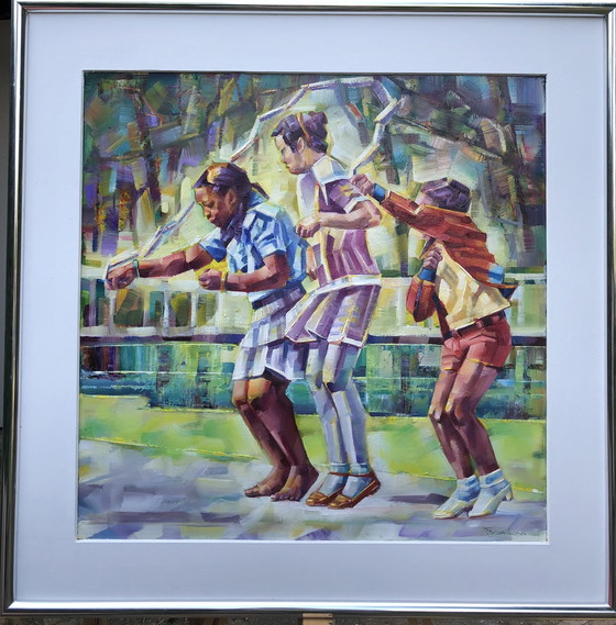 Seilspringen, Öl auf Platte.