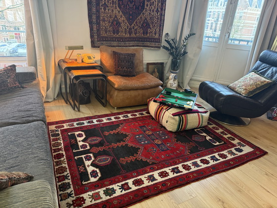 Ein antiker, handgeknüpfter Stammes-Teppich mit unverwechselbarem grafischem und folkloristischem Charakter. Gefertigt in der ersten Hälfte des 20. Jahrhunderts, strahlt dieses Stück Handwerkskunst, Geschichte und Symbolik aus.