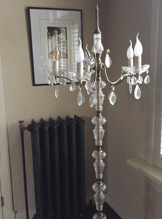 Dieser schöne Stehlüster wurde vollständig restauriert und strahlt mit seinem blattvergoldeten Sockel Eleganz aus. Der Kronleuchter verfügt über Glaselemente, die das Licht wunderschön reflektieren und ein stimmungsvolles Ambiente schaffen. Dieser Kronleuchter ist ideal für klassische Innenräume und verleiht jedem Zimmer einen Hauch von Luxus. Der Wert dieses Kronleuchters wird auf 1.000 Euro geschätzt. Eine Abholung ist nach Absprache möglich.