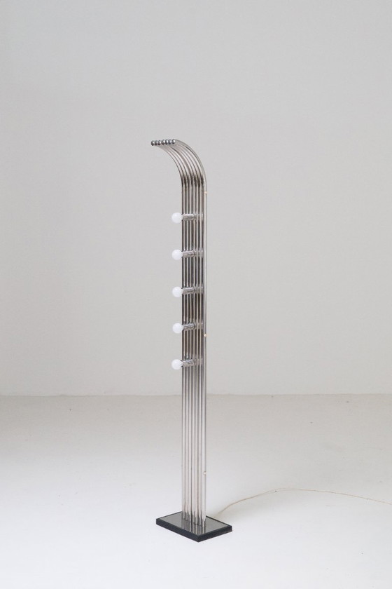 Eine markante italienische Stehleuchte aus den 1970er-Jahren. Sie besteht aus einem vertikalen Bündel polierter Chromrohre, die sich elegant von einem minimalistischen, quadratischen Sockel erheben und sich nach oben sanft biegen. Die Leuchte integriert mehrere freiliegende Kugellampen an der Vorderseite, die ein rhythmisches Lichtspiel erzeugen und die skulpturale Silhouette der Lampe betonen.