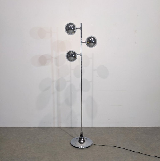 Verchromte Metall-Stehlampe mit drei Armen. Drei drehbare, kugelförmige Leuchten in Form von Augäpfeln – typisch für den Space-Age-Stil der 1970er Jahre.