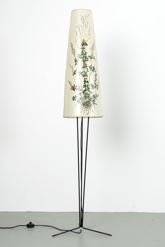 Stehlampe von Hesse Leuchten mit Vintage-Lampenschirm. Der Schirm ist mit echten Trockenblumen verziert. An einigen Stellen fehlen Nähte. Ansonsten befindet er sich in gutem Vintage-Zustand.