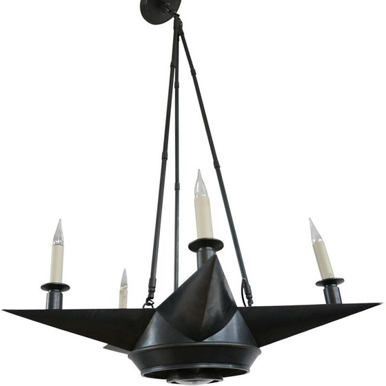Ein eleganter italienischer Kronleuchter in Sternform. Fünf erhabene Kronleuchterbirnen mit zusätzlicher Beleuchtung in dem Glaseinsatz am Sockel. Italien, 1980er Jahre. Patiniertes Metall. Sehr gute Qualität, die Originalrosette ist erhalten. Neu verkabelt und von PAT geprüft. PREIS UND VERKAUF PRO STÜCK. Abmessungen: 117 H x 70 B x 70 T in cm.