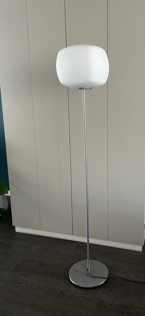 Wunderschöne Stehlampe im minimalistischen Design. Die Lampe hat einen weißen, mattierten Glasschirm und einen matten Metallfuß. Sie ist ca. 180 cm hoch. Die Lampe spendet warmes, stimmungsvolles Licht und ist dimmbar. Lampe und Fuß sind in gutem Zustand. Ideal für Wohn- oder Schlafzimmer.