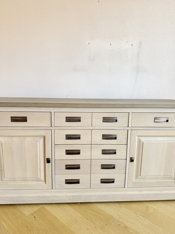 Wunderschönes Sideboard im Landhausstil, ideal für Ess- und Wohnzimmer. Dieses Möbelstück ist aus massiver Eiche gefertigt und in exzellentem Zustand. Dank der vielen Schubladen und Schranktüren bietet es viel praktischen Stauraum.