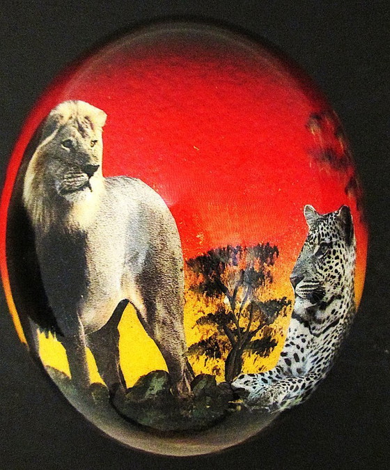 Details zur Dekoration: Das Motiv zeigt die Tiere typischerweise vor dem Hintergrund eines afrikanischen Sonnenuntergangs in satten Rot-, Orange- und Gelbtönen. Manche Eier enthalten auch andere Elemente, wie zum Beispiel eine Karte von Afrika oder Inschriften im San-Stil.