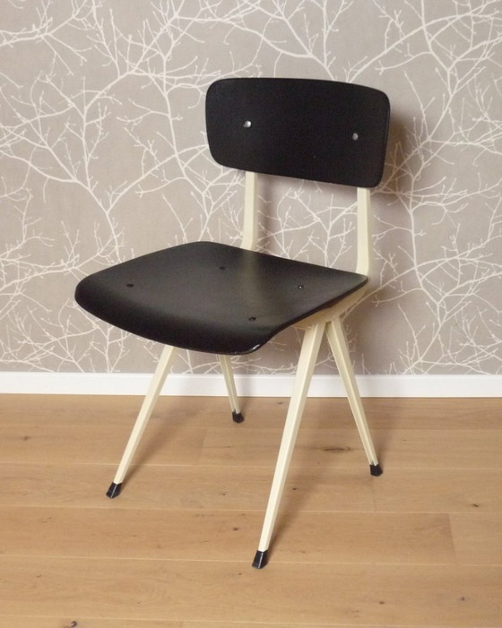Stuhl "Result" entworfen von Friso Kramer hier in der Version mit mattschwarzer Sitzfläche und Rückenlehne und cremefarbenem Stahlgestell.