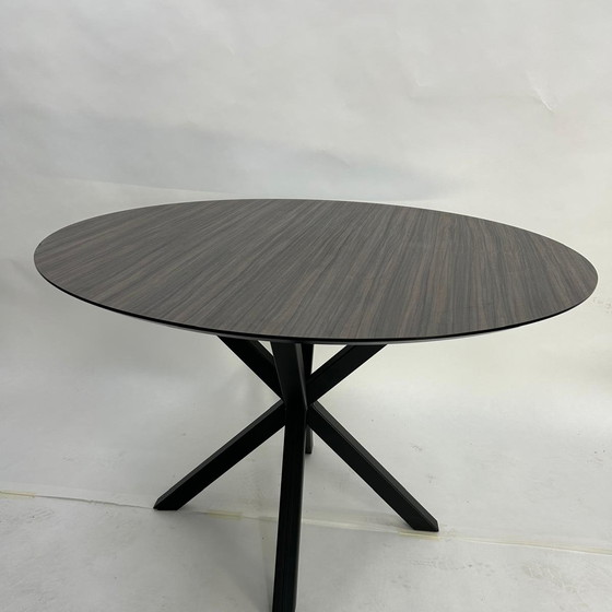 Sumisura Runder Esstisch – Ø 120 cm – Durchmesser 120 cm – Tischplatte aus dunkelbraunem/grauem Holz – abgeschrägte schwarze Kante – 5x5 schwarzes Gestell. Ein wunderschöner, moderner Esstisch in Mattschwarz mit einer eleganten, schlichten Holzkante. Die Tischplatte besteht aus Birkensperrholz und ist mit HPL beschichtet. Hochdrucklaminat (HPL) ist eine Kombination aus Zellstoff und Phenolharz mit einer harten Deckschicht aus Melaminharz. Diese Deckschicht sorgt für hohe Strapazierfähigkeit. Der Tisch war Ausstellungsstück auf einer Messe, ist in gutem Zustand, weist jedoch einige kleine Flecken auf der Tischplatte auf. Siehe Bilder.